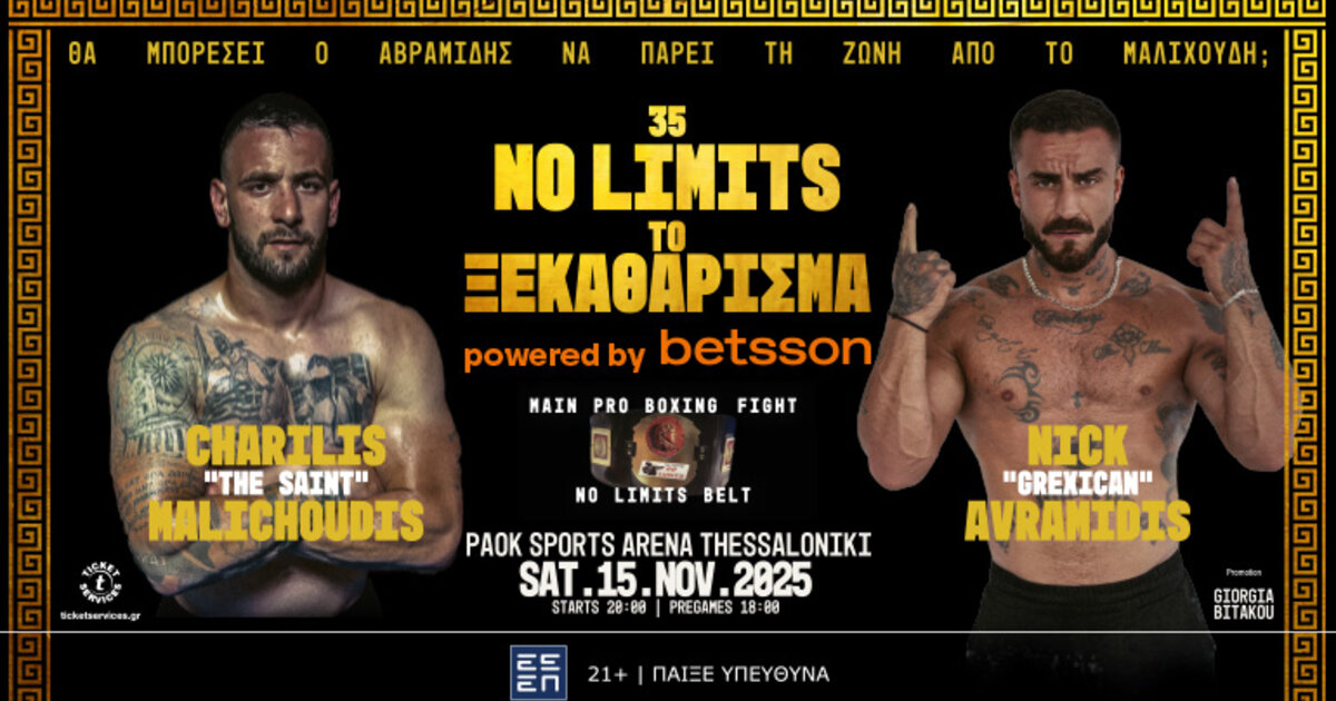 Το No Limits powered by Betsson, το μακροβιότερο fight show στην Ελλάδα, που ίδρυσαν τα αδέρφια Γεωργία και Σταμάτης Μπιτάκου, υπόσχεται μια ανεπανάληπτη βραδιά γεμάτη δράση, ένταση και πάθος, με την πιο πολυαναμενόμενη αναμέτρηση στα 84 kg ανάμεσα στον Χαρίλη “The Saint” Μαλιχούδη και τον Νίκο “Grexican” Αβραμίδη, αλλά και δυνατά fights τίτλου στο K-1.