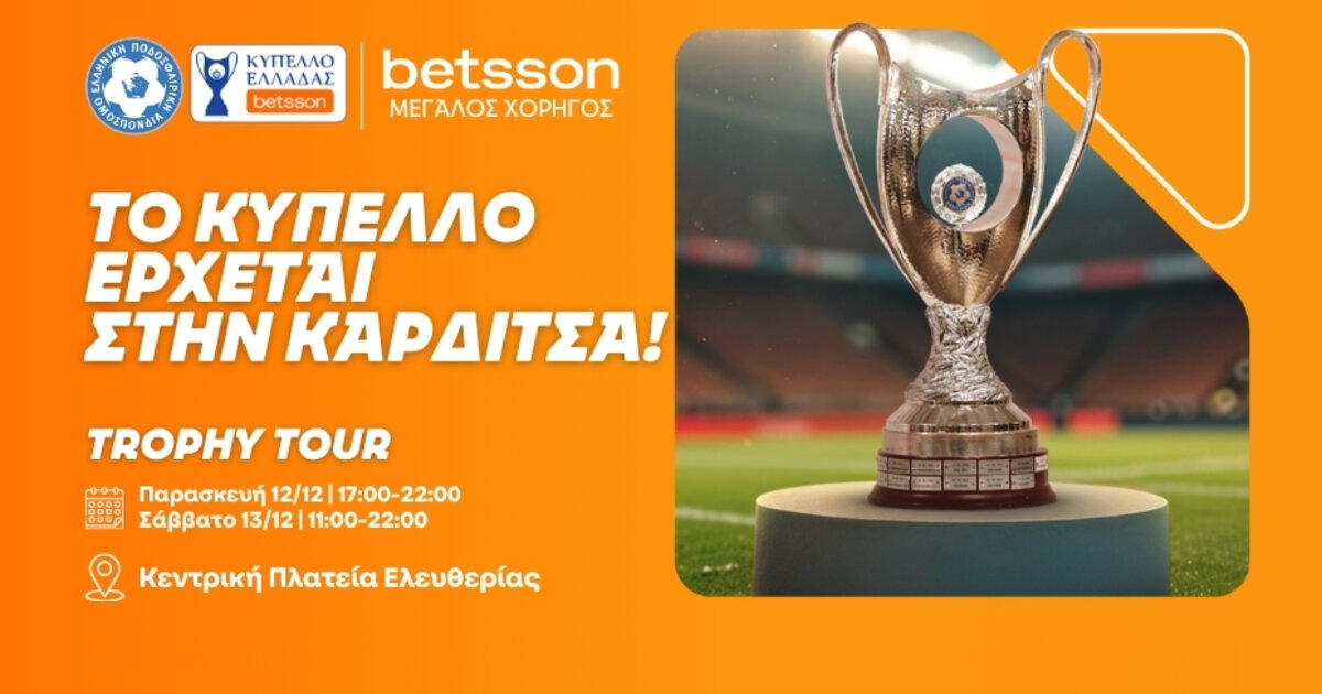 Το ταξίδι του BetssonTrophy Tour συνεχίζεται και, μετά από τρεις δυναμικές στάσεις, η Καρδίτσα ετοιμάζεται να υποδεχθεί το τρόπαιο του Κυπέλλου Ελλάδας Betsson στις 12 και 13 Δεκεμβρίου. Μία πόλη με έντονη αθλητική κουλτούρα γίνεται το επόμενο σημείο συνάντησης για όλους και θα έχουν την ευκαιρία να ζήσουν από κοντά αυτή τη μοναδική εμπειρία.