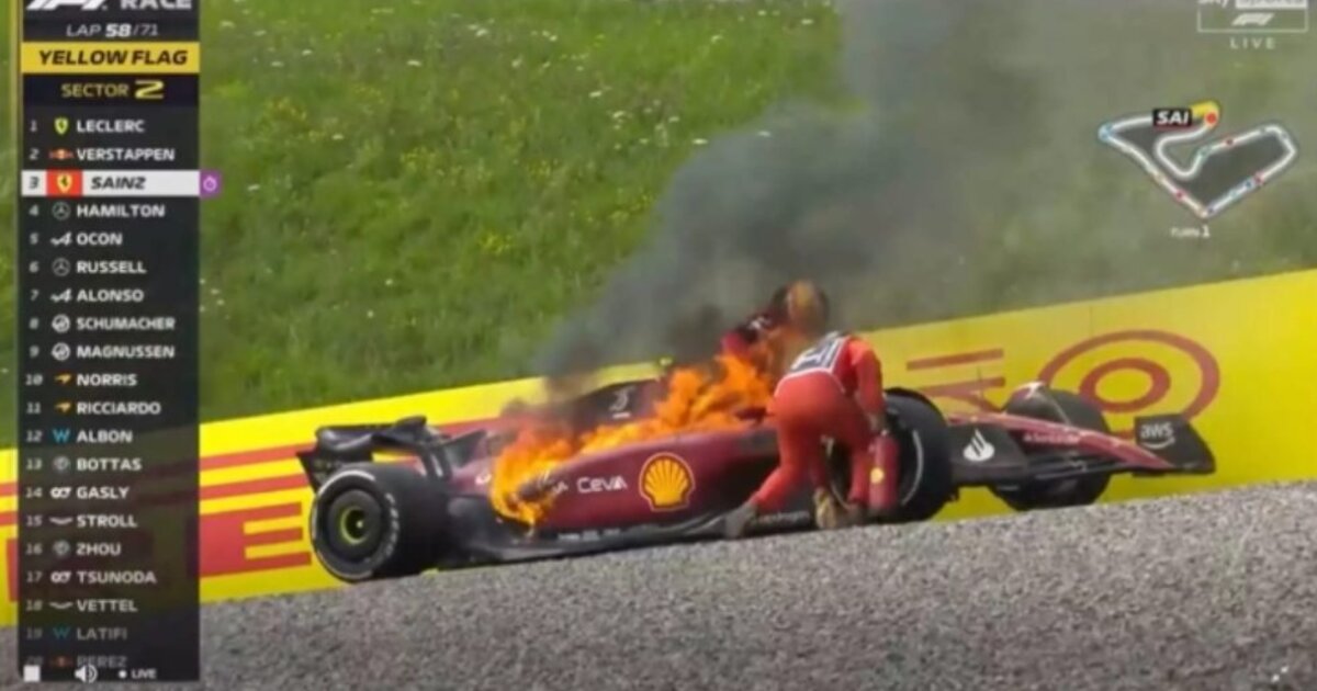 Η Ferrari του Κάρλος Σάινθ πήρε φωτιά λίγο πριν το φινάλε του Γκραν Πρι της Αυστρίας στη Formula 1, με τον Ισπανό πιλότο να βγαίνει πάντως αλώβητος από το μονοθέσιό του.