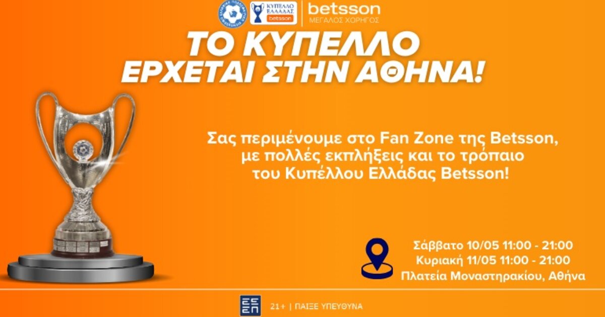 Η ΕΠΟ και η Betsson, Μεγάλη Χορηγός του Κυπέλλου Ελλάδας Betsson, φέρνουν την καρδιά του ποδοσφαίρου στο κέντρο της Αθήνας και σας προσκαλούν σε ένα ξεχωριστό Fan Zone στην πλατεία Μοναστηρακίου, το Σάββατο 10 και την Κυριακή 11 Μαΐου, από τις 11:00 έως τις 21:00. Λίγες ημέρες πριν τον μεγάλο από τελικό του Κυπέλλου, η Αθήνα «φορά» τα ποδοσφαιρικά της και ετοιμάζεται για ένα διήμερο γιορτής, ενθουσιασμού και διασκέδασης για μικρούς και μεγάλους.