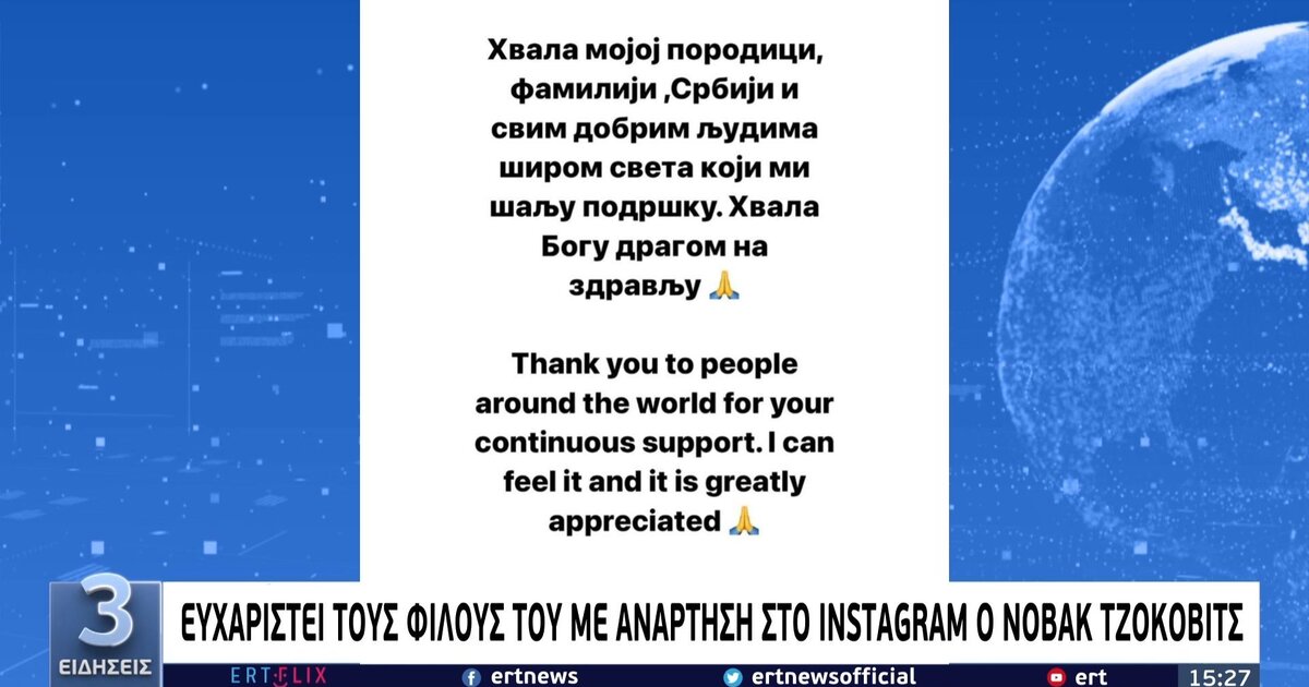 Ο κορυφαίος Σέρβος τενίστας, Νόβακ Τζόκοβιτς, ο οποίος παραμένει στη Μελβούρνη, ευχαρίστησε τον κόσμο για την στήριξη που του δείχνει μέσω ανάρτησης που πραγματοποίησε στα social media του.