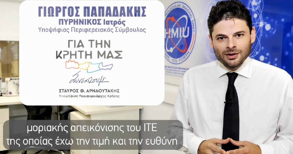 Ο Γιώργος Παπαδάκης Πυρηνικός Ιατρός και Επιστημονικός Υπεύθυνος της Μονάδας Υβριδικών Τεχνικών Μοριακής Απεικόνισης του ΙΤΕ, καταθέτει καινοτόμες προτάσεις σηματοδοτώντας την υποψηφιότητα του στην Περιφέρεια Κρήτης με τον Σταύρο Αρναουτάκη.