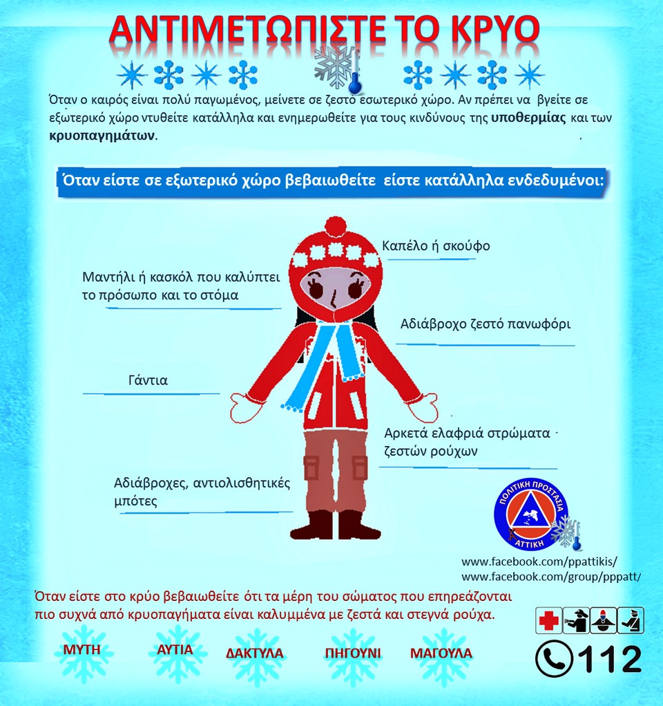 Σίγουρα προσεκτικοί θα πρέπει να είμαστε και με την ένδυσή μας, καλύπτοντας με ζεστά και στεγνά ρούχα, κυρίως τα μέρη του σώματος που επηρεάζονται πιο συχνά από κρυοπαγήματα.