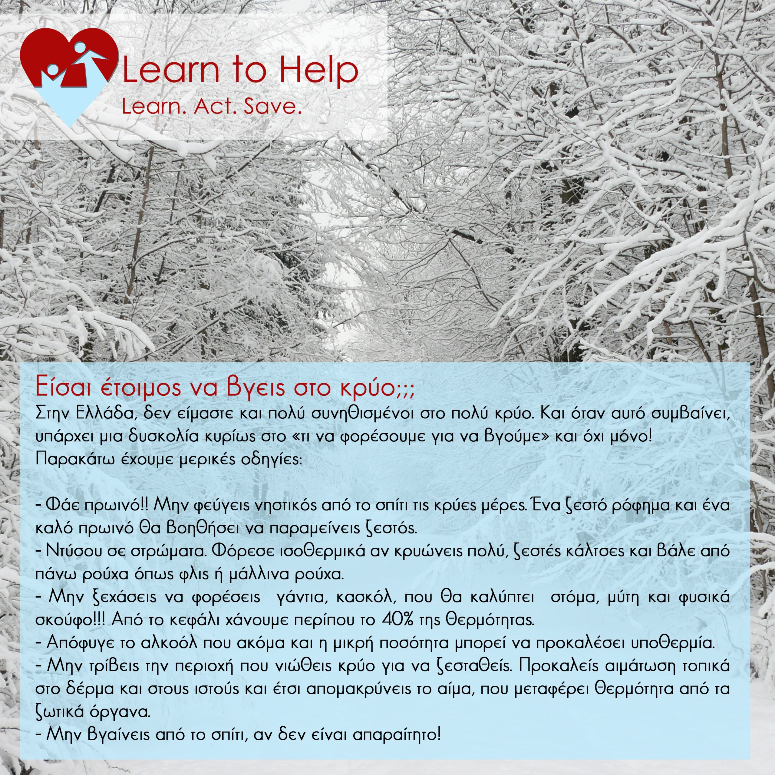 "Σκωτσέζικο ντους" μας κάνει ο καιρός, τα τελευταία 24ωρα, ωστόσο με δεδομένο ότι στην Ελλάδα δεν έχουμε συνηθίσει τις πολύ χαμηλές θερμοκρασίες, ο οργανισμός Learn2help παρέχει οδηγίες για το κρύο!