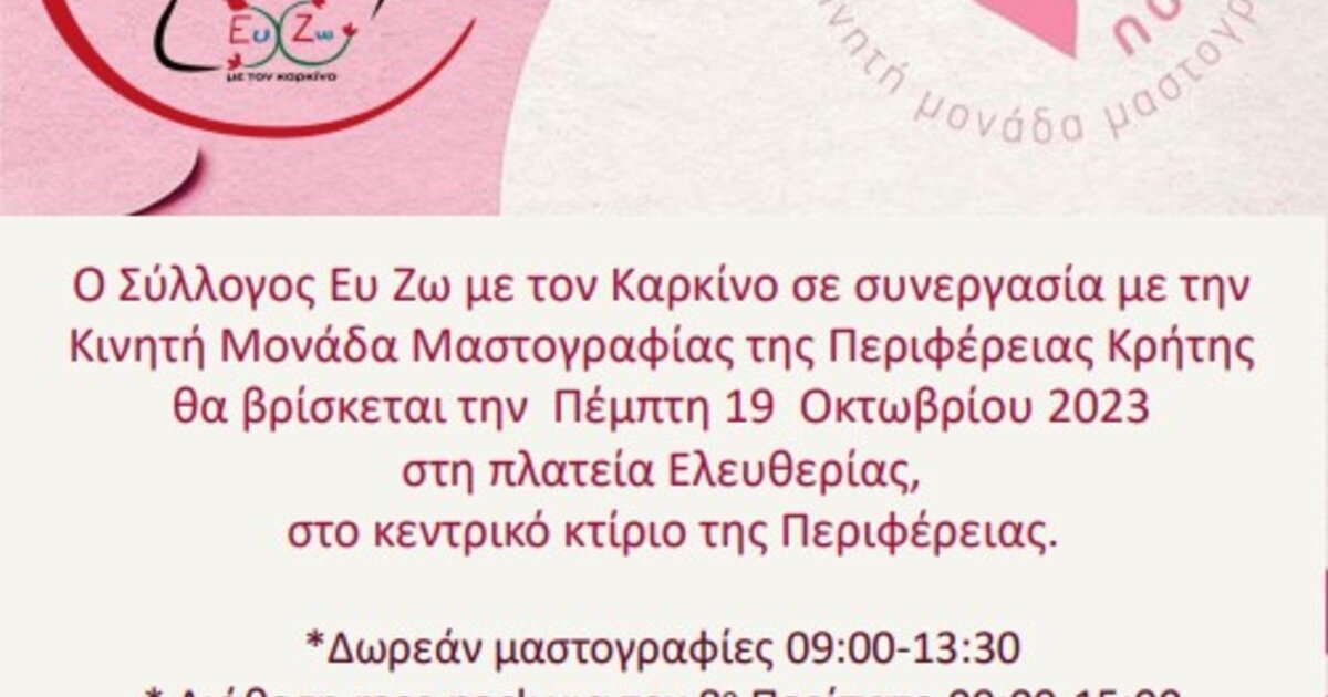 Ο Σύλλογος στήριξης ασθενών με νεοπλασματική νόσο «Ευ Ζω με τον Καρκίνο» και η Περιφέρεια Κρήτης συνδιοργανώνουν δράση για την ενημέρωση του κοινού ως προς την σημαντικότητα της πρόληψης και πρώιμης διάγνωσης του καρκίνου του μαστού.