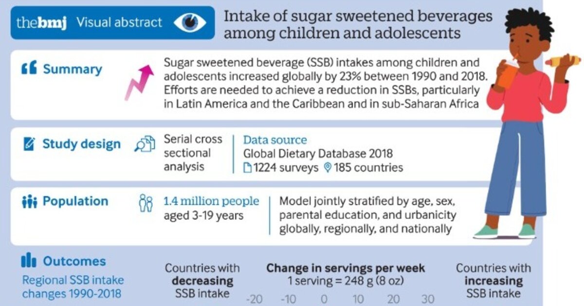 Τα παιδιά και οι έφηβοι σε 56 χώρες, που αντιπροσωπεύουν 238 εκατομμύρια νέους ή το 10% του παγκόσμιου νεανικού πληθυσμού, κατανάλωναν κατά μέσο όρο επτά ή περισσότερες μερίδες την εβδομάδα. Ανάμεσα στα κράτη με την υψηλότερη πρόσληψη ζαχαρούχων ποτών από τα παιδιά και τους νέους το 2018 ήταν το Μεξικό (10,1 μερίδες την εβδομάδα), η Ουγκάντα (6,9), το Πακιστάν (6,4), η Νότια Αφρική (6,2) και οι ΗΠΑ (6,2). Εξετάζοντας τις τάσεις από το 1990 ως το 2018, η περιοχή με τη μεγαλύτερη αύξηση στην κατανάλωση μεταξύ των νέων ήταν η υποσαχάρια Αφρική, όπου οι μέσες εβδομαδιαίες μερίδες αυξήθηκαν κατά 106%, δηλαδή 2,17 μερίδες την εβδομάδα.