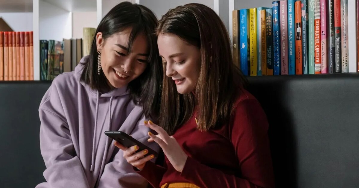 Εφηβες κοιτάζουν την οθόνη κινητού και γελούν