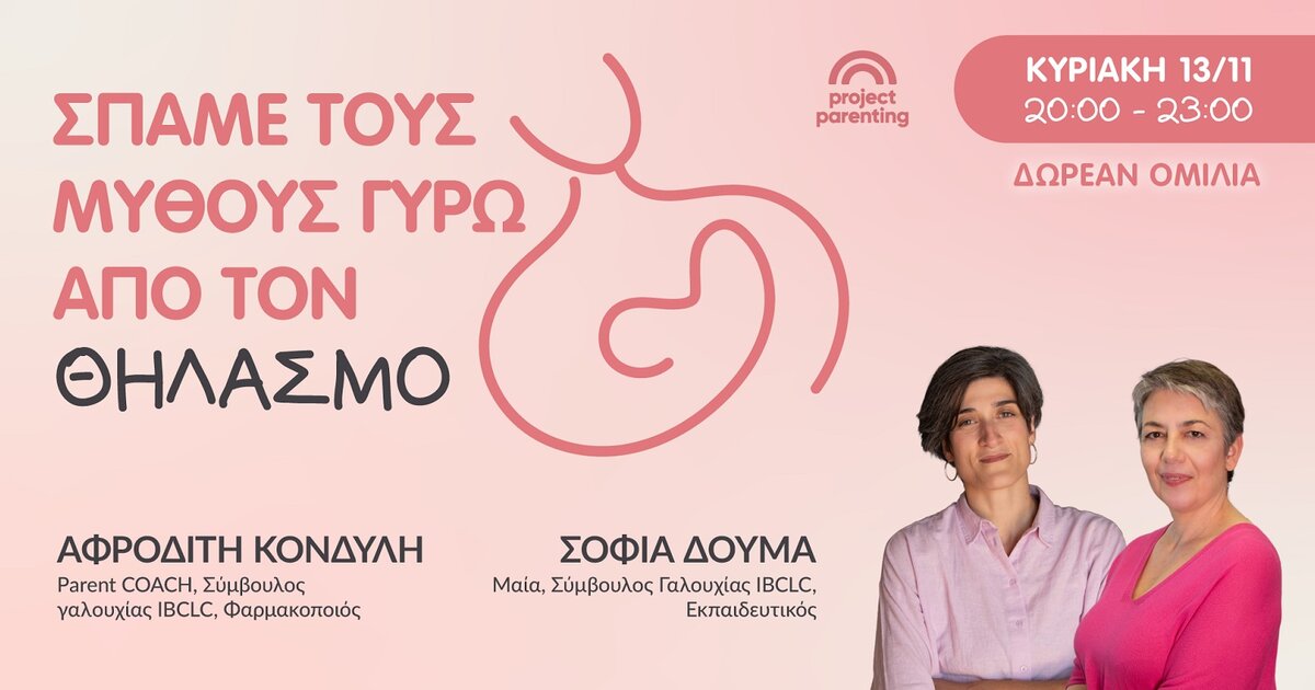 Η ομιλία θα γίνει μέσω διαδικτυακής πλατφόρμας και θα είναι ανοιχτή και εντελώς δωρεάν για όλους. Την ομιλία θα πλαισιώσουν οι καταρτισμένες επαγγελματίες - συνεργάτες του Project Parenting: Αφροδίτη Κονδύλη - AATH Εκπαιδεύτρια Γονέων, PCI Certified Parent Coach®, Σύμβουλος Θηλασμού IBCLC & Σοφία Δούμα, Μαία, Σύμβουλος Θηλασμού IBCLC, Birthlight™ Perinatal Yoga Instructor